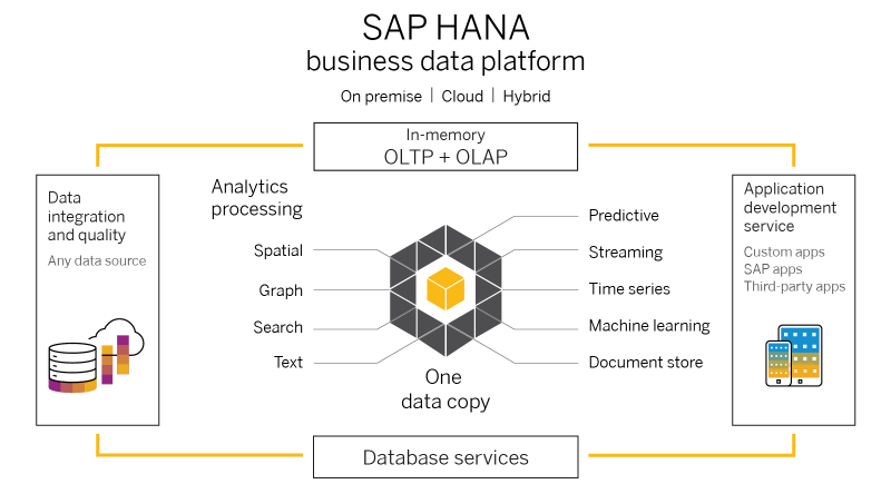 SAP HANA is a business data platform that processes transactions and analytics at the same time on any data type, with built-in advanced analytics and multi-model data processing engines that can be leveraged to develop next-generation applications for the intelligent enterprise.